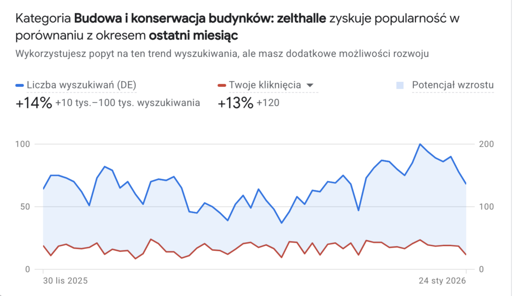 Przeprowadzona została analiza wyszukiwań, która pokazała, że użytkownicy z Niemiec coraz częściej poszukują wykonawców hal stalowych z Polski. Na tej podstawie kampanie zostały zaplanowane osobno dla rynku polskiego i niemieckiego, z dopasowaniem słów kluczowych i komunikatów do realnych intencji inwestorów, co jest kluczowe w skutecznej reklamie B2B na rynkach zagranicznych.