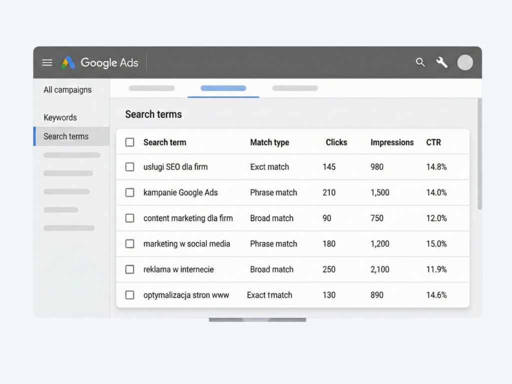 Na podstawie danych warto regularnie optymalizować listy słów kluczowych. Frazy, które brzmią dobrze w nagłówku, ale nie dowożą wyników, powinny zostać ograniczone, zmodyfikowane lub całkowicie wykluczone. Z kolei te, które dobrze konwertują i dobrze „układają się” w dynamicznych nagłówkach, mogą stać się podstawą do dalszego skalowania kampanii lub stworzenia dedykowanych grup reklam.